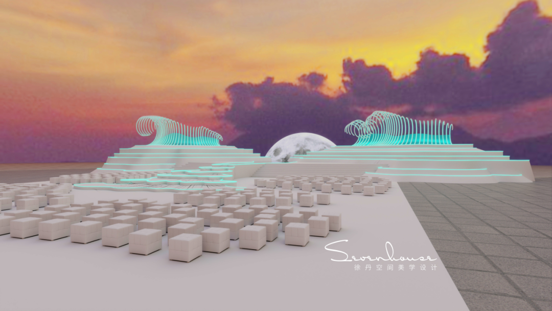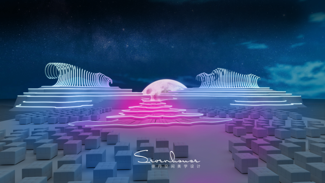 梯台设计灵感来源于婚纱的裙摆,整个梯台联通主舞台的镜面通道犹如一个月亮女神穿起了美丽的婚纱
